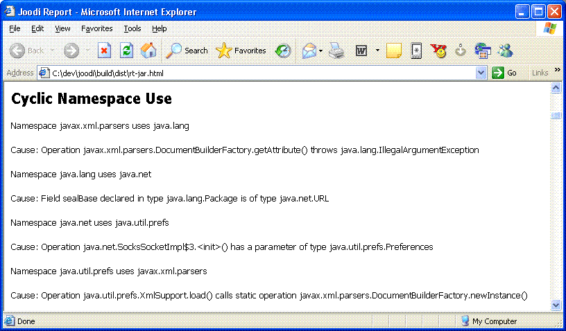 As mentioned above, one of the nice things about joodi is that you get traceability to the cause of the design issue. For example, below is a snippet of a joodi report that detected a cyclic package (joodi calls them namespaces) dependency when run against the java runtime library (rt.jar):